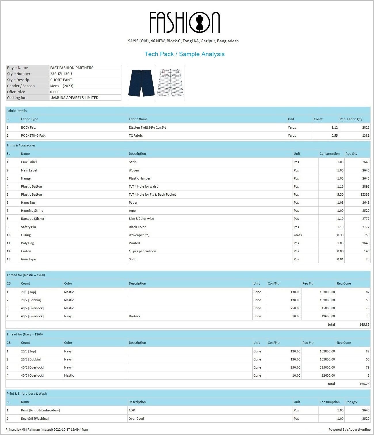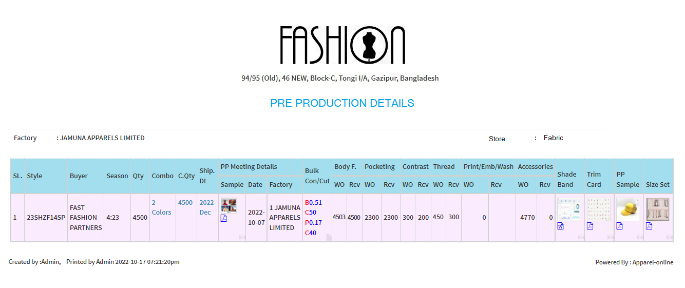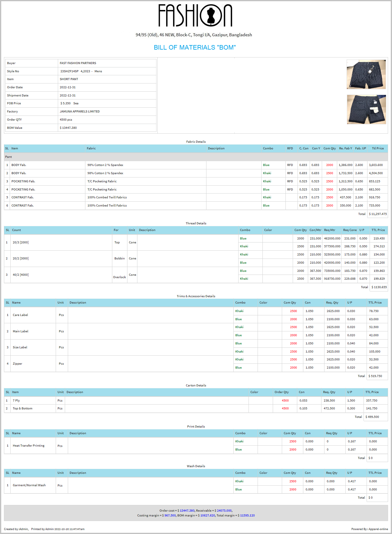 Bill of Materials (BOM): The module allows users to select a pre-developed specification. The Software will automatically generate the BOM based on the sample development records and the market price of the product for sourcing, budgeting, and manufacturing of the Garments.