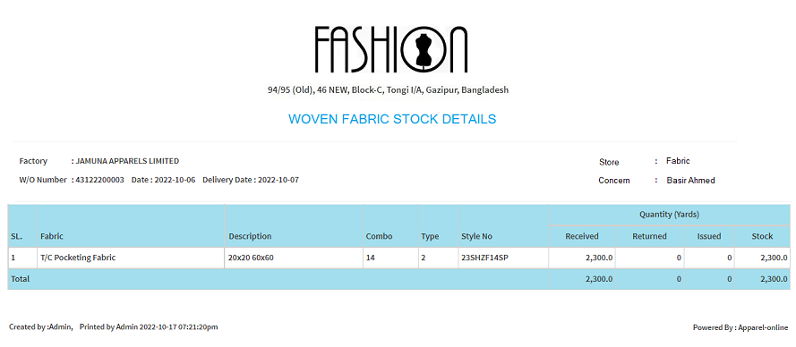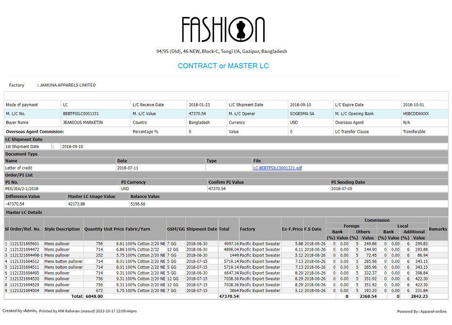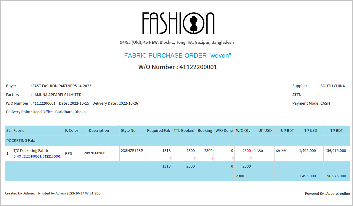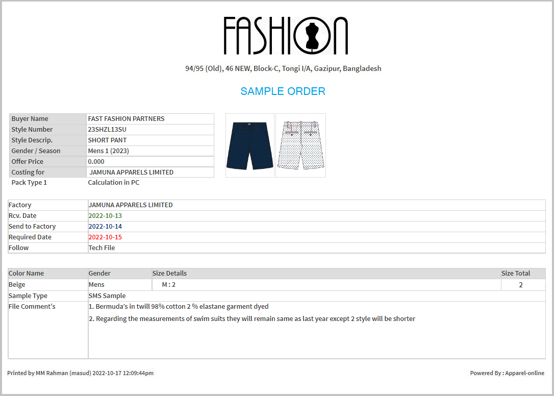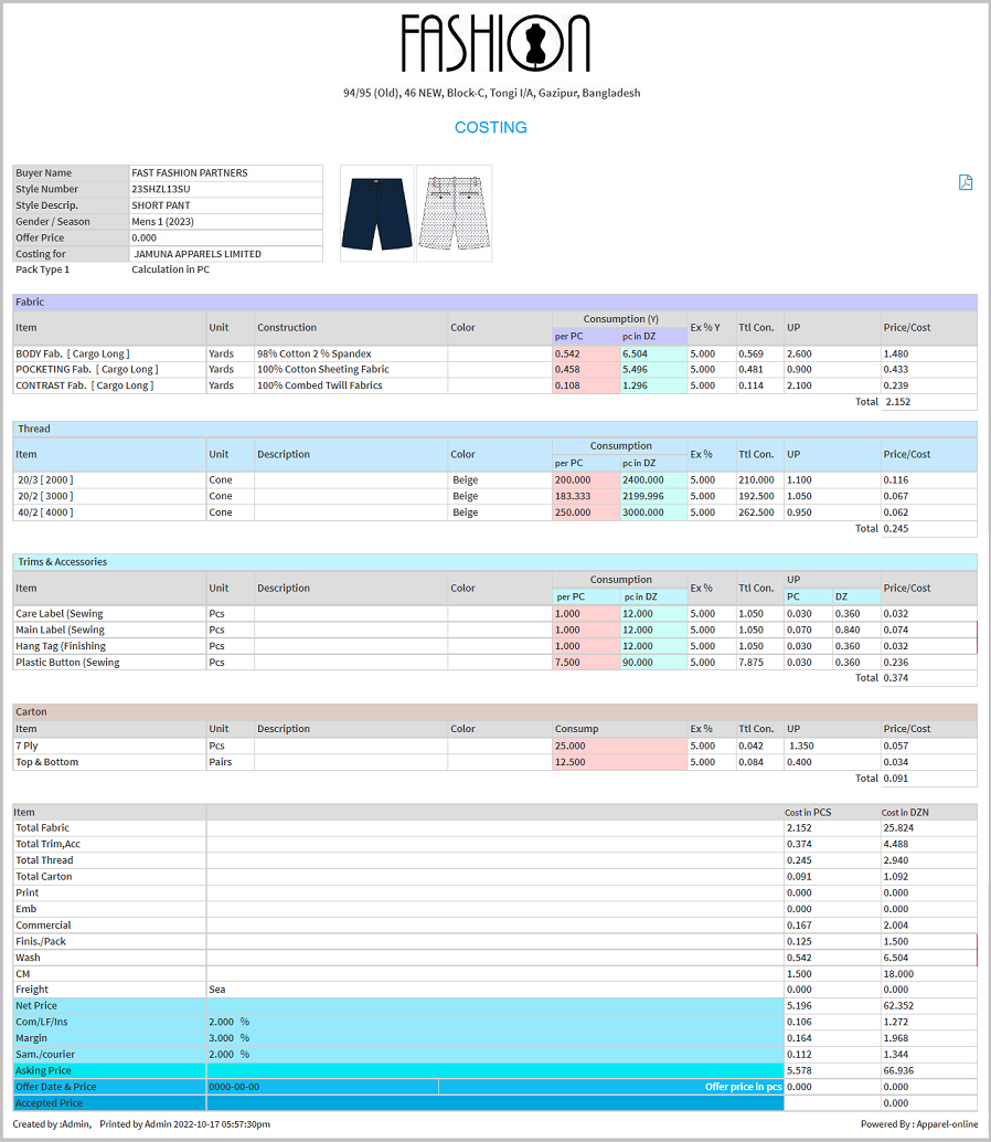 Bill of Materials (BOM): The module allows users to select a pre-developed specification. The Software will automatically generate the BOM based on the sample development records and the market price of the product for sourcing, budgeting, and manufacturing of the Garments.